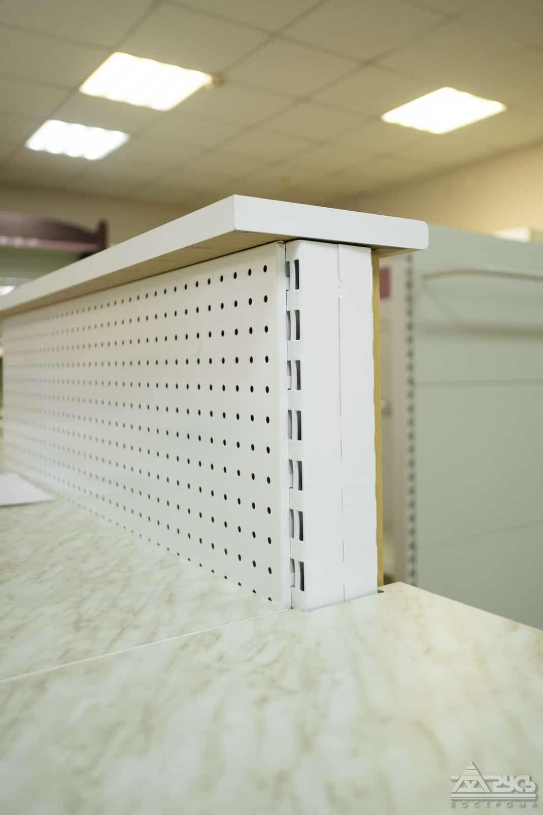 Перфорированные и экономпанели могут комплектоваться крючками и корзинами. Модули комплектуются подставками под сумки из лдсп, фронтальными полками с ценникодержателями и ограничителями. Боковины могут быть изготовлены из ЛДСП или МДФ как и столешницы — это придает конструкции презентабельный вид.