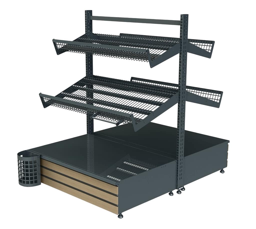 Многофункциональный модульный развал для выкладки овощей и фруктов. Оснащён металлическими ярусными полками и просторной нижней базой с декоративными панелями под дерево. Конструкция выдерживает высокие нагрузки, удобна в обслуживании и подходит для островного размещения в торговом зале. Отличается повышенной вместимостью и удобным доступом к продукции
