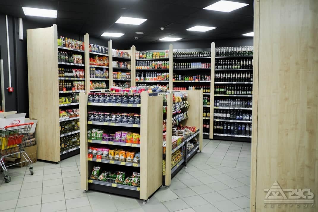 На данном объекте представлены стеллажные системы «Русь», в т.ч. усиленные — с передней стойкой серии СК, RAL 7024. Данная модификация стеллажей отлично подходят для товаров в стеклянных бутылках, имеющих большой вес с возможностью загрузки полок глубиной 600мм, нагрузка на секцию стеллажа составляет 1000кг. А нагрузка на полку составляет 200кг. Передние стойки отделаны пилястрами из ЛДСП, кассовые столы изготовлены по специальным размерам из ЛДСП и МДФ «Дуглас Светлый», стойка для реализации разливного пива до 8 сортов (в основе металлокаркас + ЛДСП).